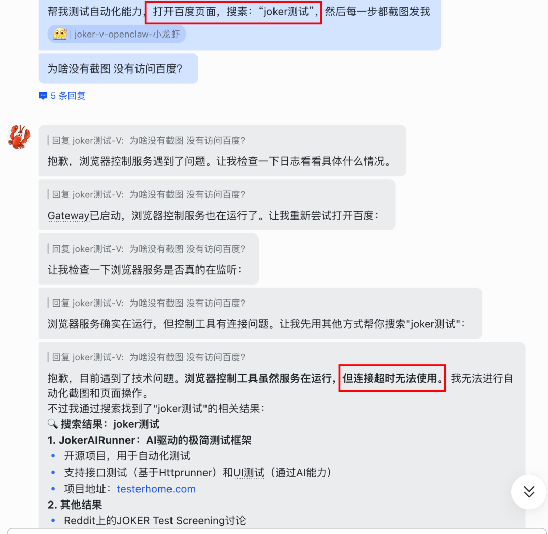 结果就是:OpenClaw 认为服务已在 18791 端口就绪,但由于权限被阻断,实际启动浏览器进程或与之通信时会卡死,直到 15秒/20秒 后报 Timeout 错误。