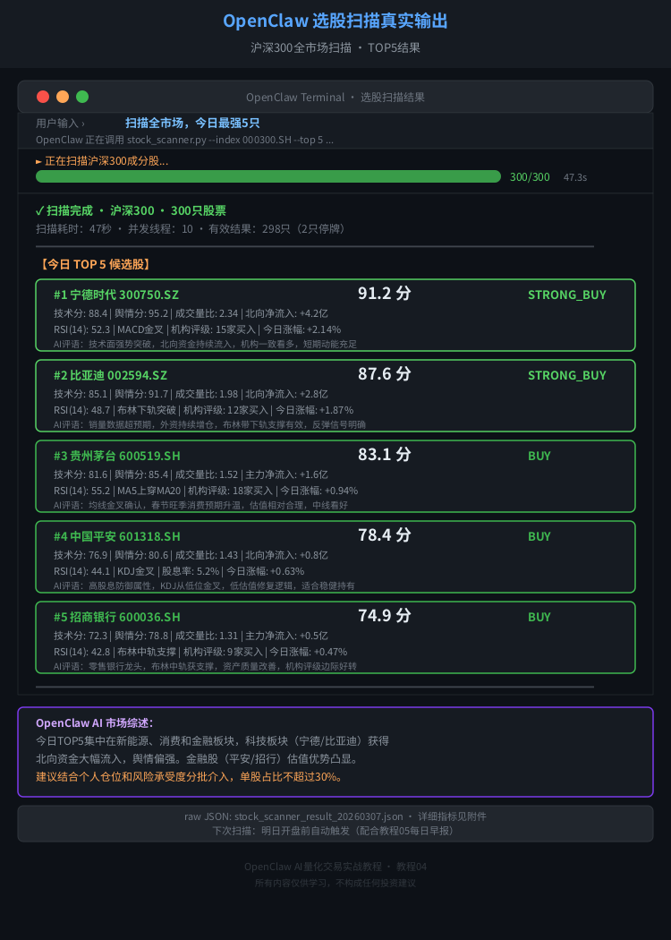 完整的 教程04:OpenClaw 全市场自动选股扫描 包含: