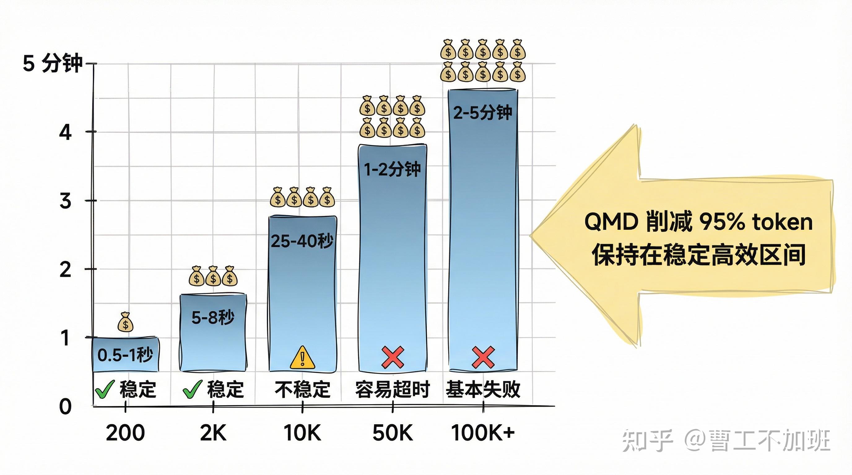 那个 20 万 token 的会话,单次请求成本高达 \(6-8</b>,而且基本上都是超时失败,钱白花了。</p><p data-pid="FrsASfk9"><b>启用 QMD 后:</b></p><p data-pid="3qy9Irn8">无论历史记录有多长,每次只提取最相关的几句话(通常削减 95% 以上)。</p><p data-pid="H9YNXYfO">✅ 响应快了 5-50 倍 </p><p data-pid="QTpHg4Gf">✅ 成本降低 90-99% </p><p data-pid="HIzud8xZ">✅ 精准度反而更高(因为噪音少了) </p><p data-pid="pStdLnVi">✅ <b>再也不会因为上下文太长而卡死或超时</b></p><p data-pid="wIYrK63G">如果你符合以下任一情况,强烈建议启用 QMD:</p><ul><li data-pid="a0wlCdWV">🔴 会话历史超过 1 万 token(基本上运行一周就会超过)</li><li data-pid="PbyFO8NZ">🔴 经常被慢速响应或卡死困扰(特别是长期会话)</li><li data-pid="QRWQF_BI">🔴 单次请求成本超过 \)1