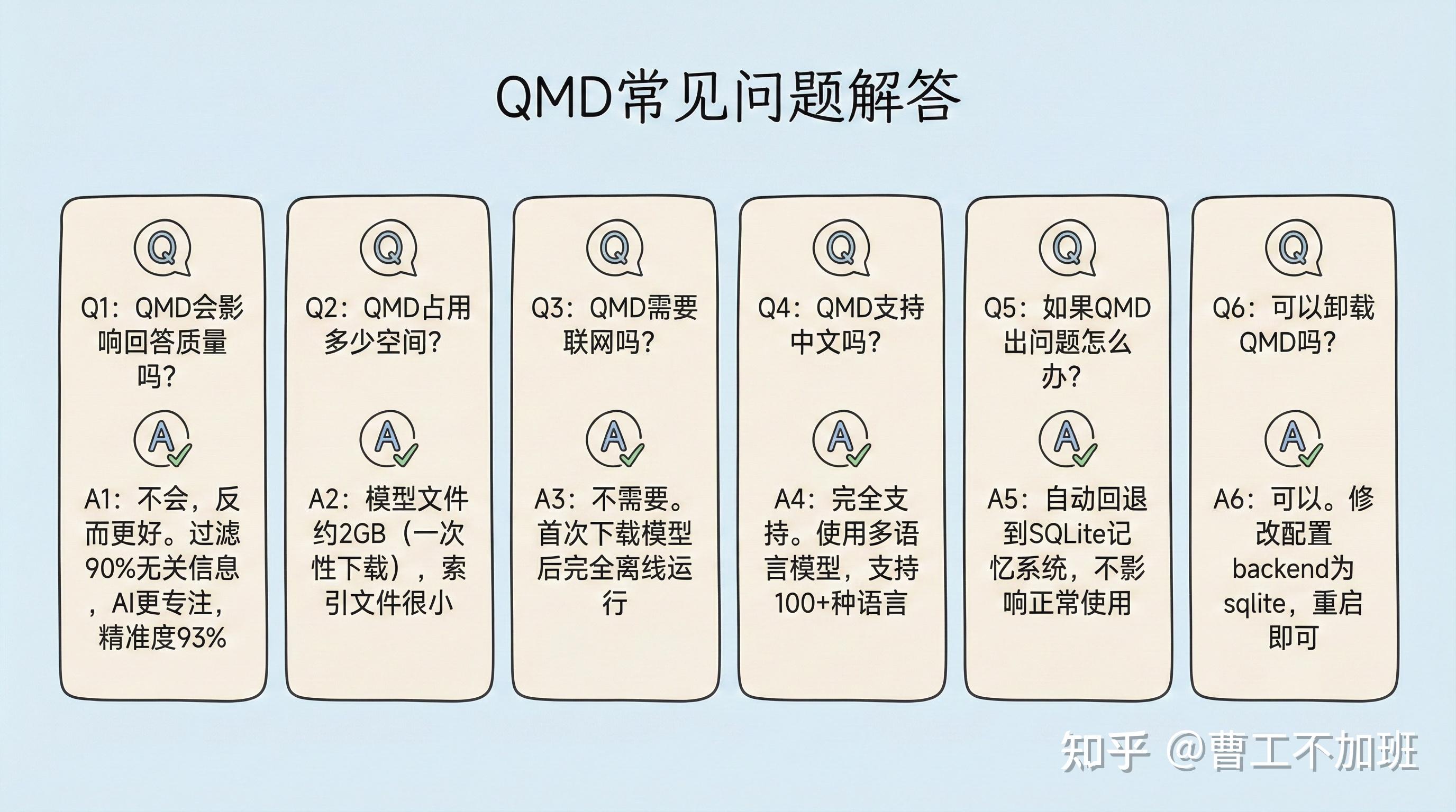 A:不会,反而会更好。因为 QMD 过滤掉了 90% 的无关信息,AI 更容易专注于真正相关的内容,精准度达到 93%。
