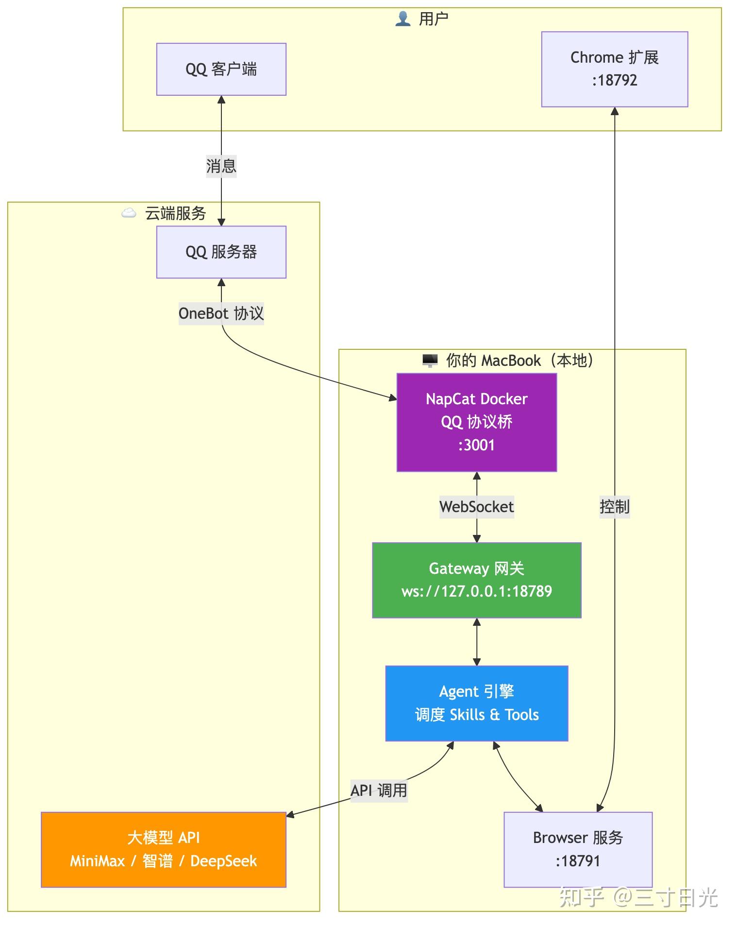 环境:macOS / Intel i7 / 16GB 内存 / 256GB 硬盘 目标:本地部署 OpenClaw + NapCat 机器人 + 远端大模型(MiniMax) 更新:2026-03-01