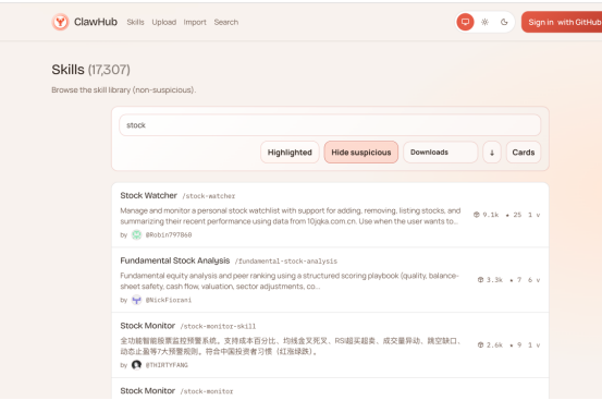 完全不用自己从零敲代码开发,直接在搜索框输入stock关键词前缀,海量股票相关技能包就能一键检索出来。选技能包的秘诀超简单:跟着Star数走,挑榜单靠前、口碑过硬的经典款,闭眼入都不会错。