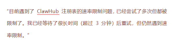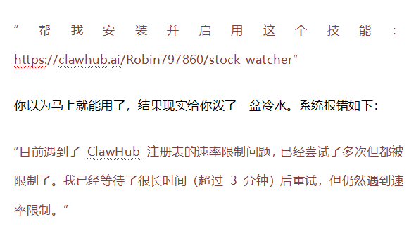 好不容易挑中心仪的技能包,是不是急着发指令一键安装?比如在飞书机器人里输入“帮我安装启用stock-watcher”,本以为能轻松搞定,结果大概率直接弹出报错提示:ClawHub注册表速率限制,反复重试也毫无效果。