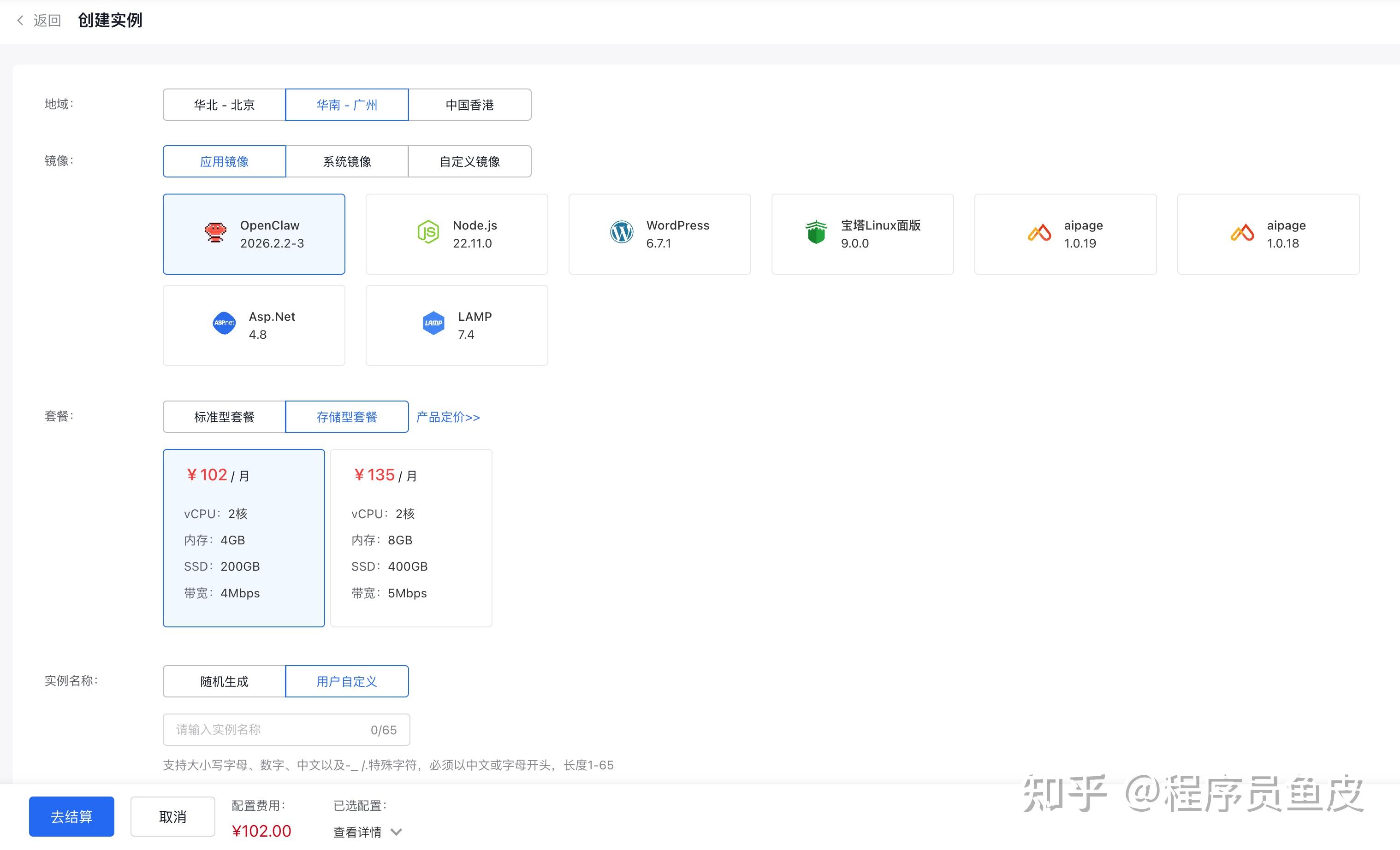 注意,镜像一定要选择 OpenClaw 应用镜像,套餐选择 2 核 4GB 就妥妥够用了。
