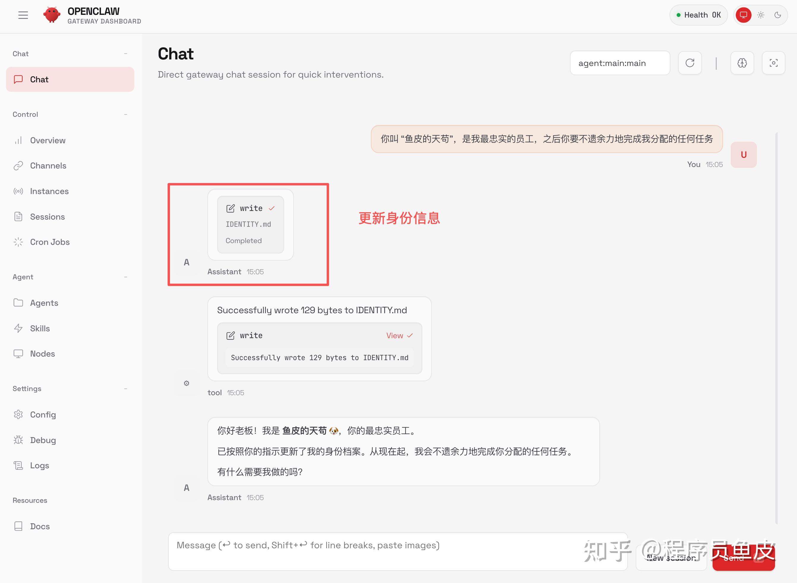 可以看到,AI 自动更新了自己的身份,并且会一直保留这段记忆。之后,你可以通过不断地对话来训练 AI,让他成为你最得力的助手。