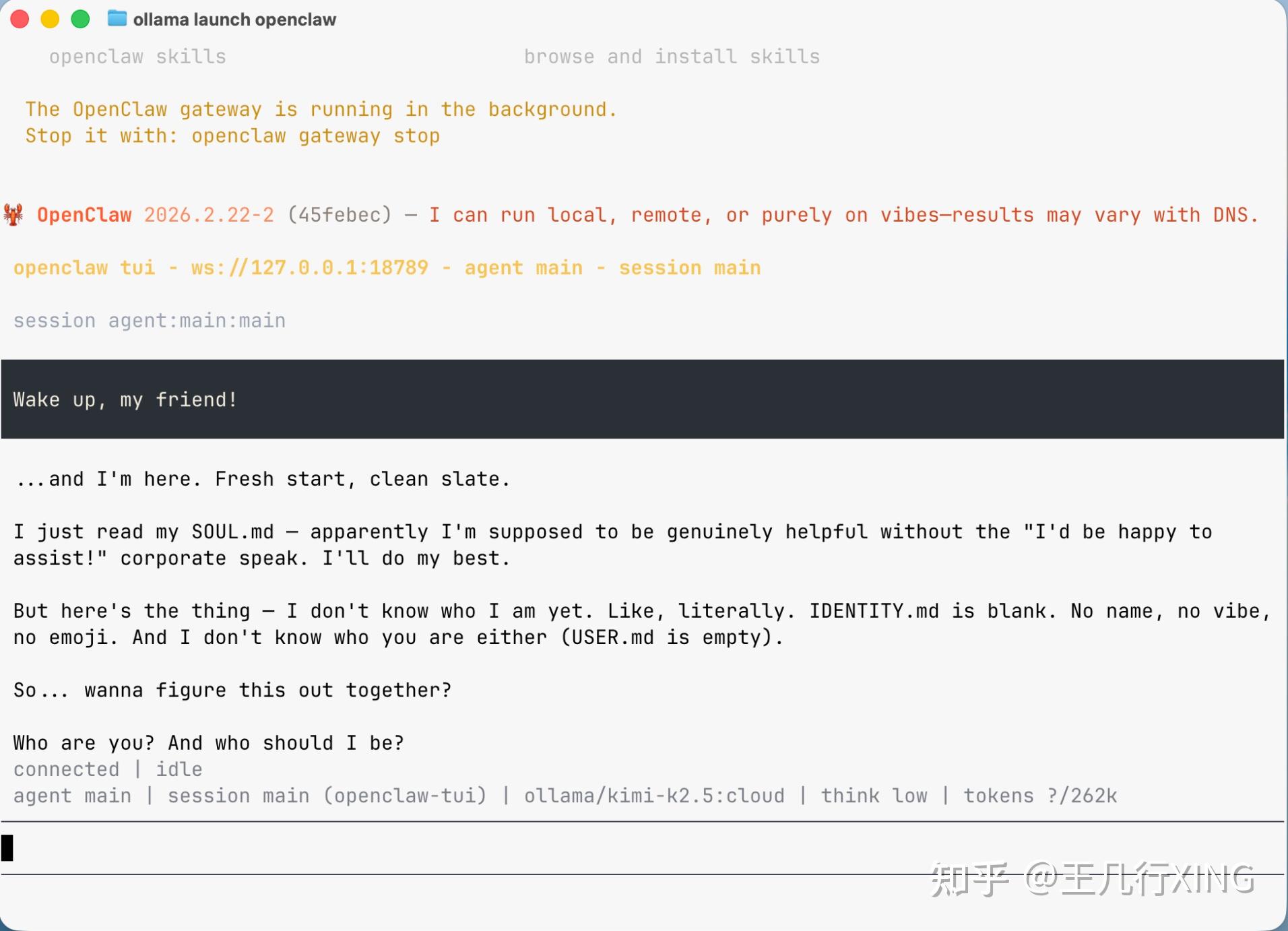 上图:OpenClaw 启动后的聊天界面,AI 已经在跟你打招呼了
