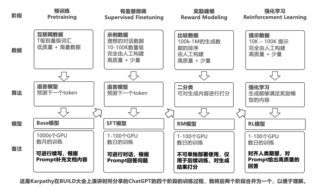 GPT的基本训练方法虽然看起来并不难理解,但要想把GPT训练出强大的能力,整个训练过程是非常耗时耗力的,完整的GPT训练包括三个大的阶段:预训练、有监督微调、强化学习(有兴趣对ChatGPT的训练过程深入研究的,可以去听一下AI大神Karpathy在2023年微软BUILD大会上的分享)。