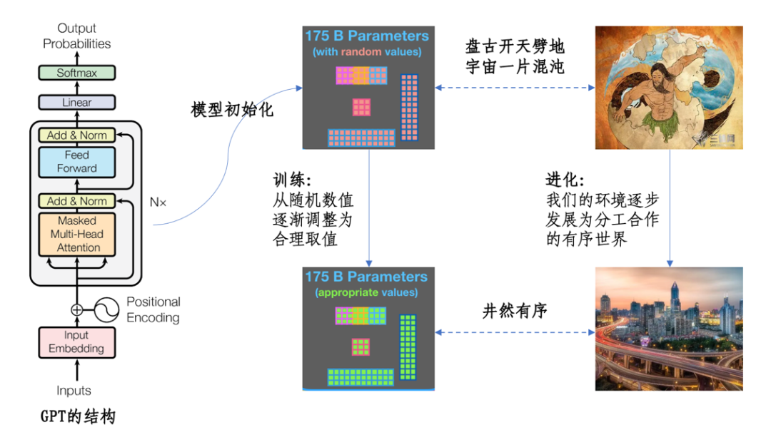GPT的训练过程,有点像孩子从小到大的学习过程,用我们已经掌握的大量知识,通过家庭、学校的持续教育,让孩子也能够理解和掌握。但与孩子学习的方法略有不同,GPT的训练是一个不断从错误中来调整自己的过程。