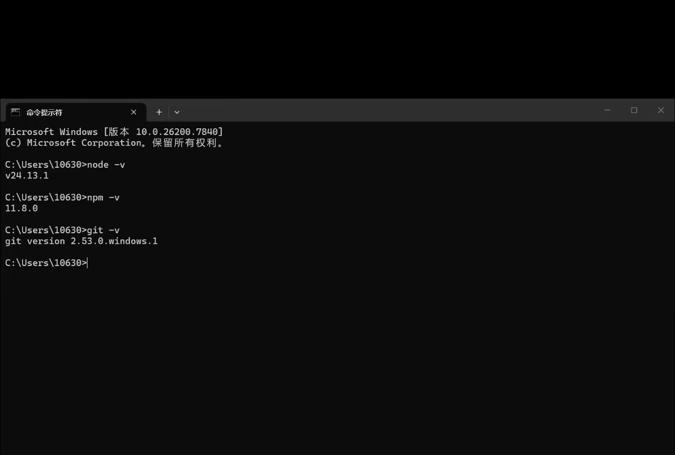 装完后打开命令行,分别输入 node -V、npm -V、git -v,能输出版本号就说明准备就绪了。