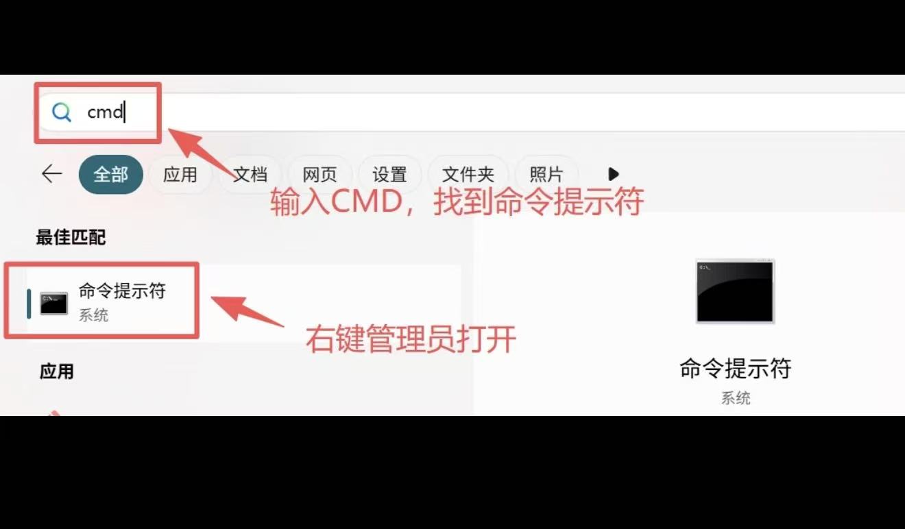 搜索“cmd”找到命令提示符,打开终端(建议以管理员身份打开)
