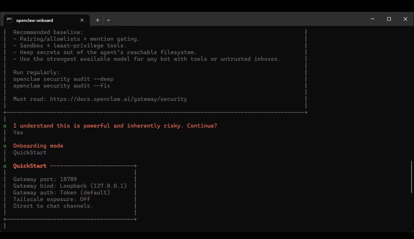 后面的问题都选跳过或no,不管是安装Skill还是配置聊天软件,后续都能在图形界面设置。