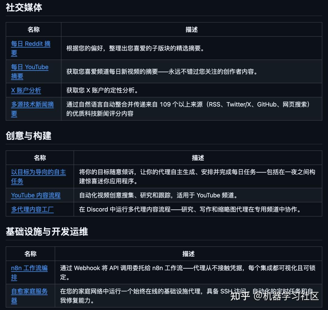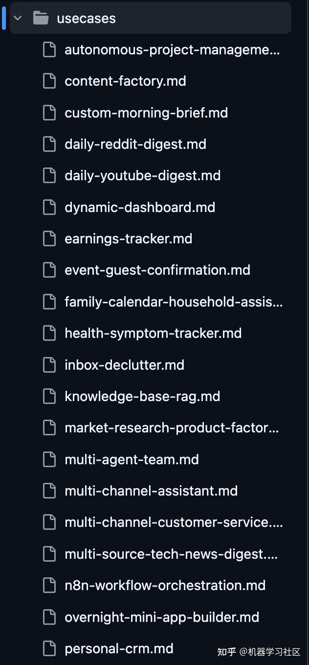 直接打开仓库的 usecases 文件夹,按类别浏览Social Media、Creative、Infrastructure、Productivity、Research、Finance 重点关注你最迫切想解决的场景类别。
