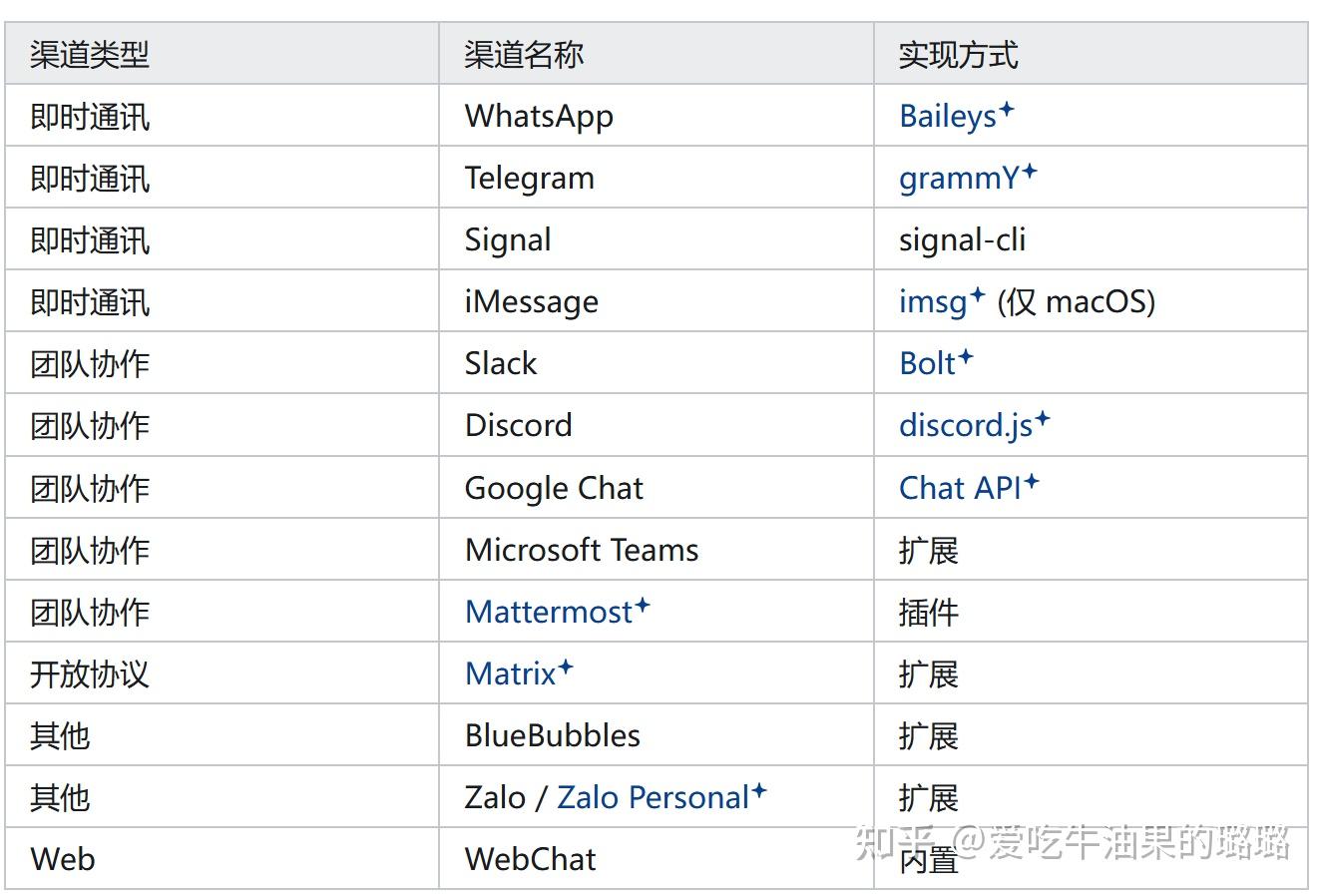 - 通讯渠道:WhatsApp、Telegram、Discord 等