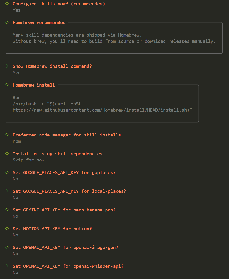 💡 这些 API Key 都是可选的,用于特定技能。没有的话全部选 No 跳过即可,后续可通过 随时补充。