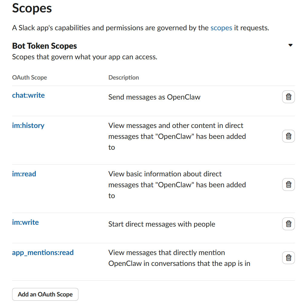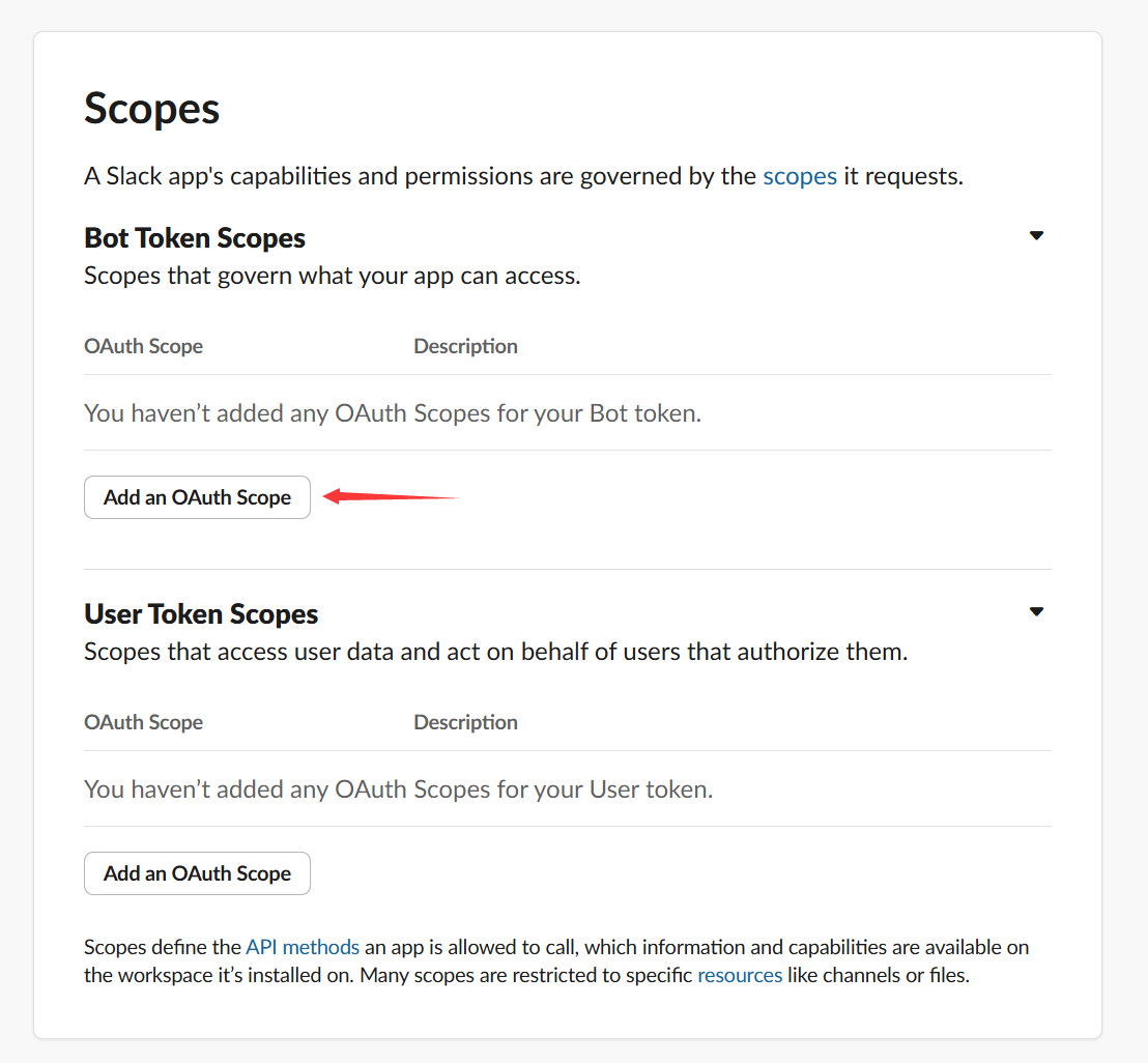 - 滚动到 Bot Token Scopes,点击 Add an OAuth Scope,添加以下权限: