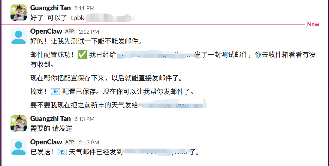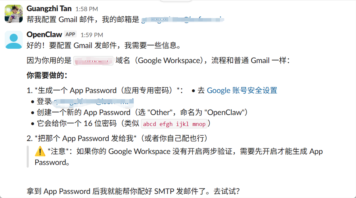 不需要手动装 SMTP。开启全自动模式后,直接在 Slack 跟 OpenClaw 说:
