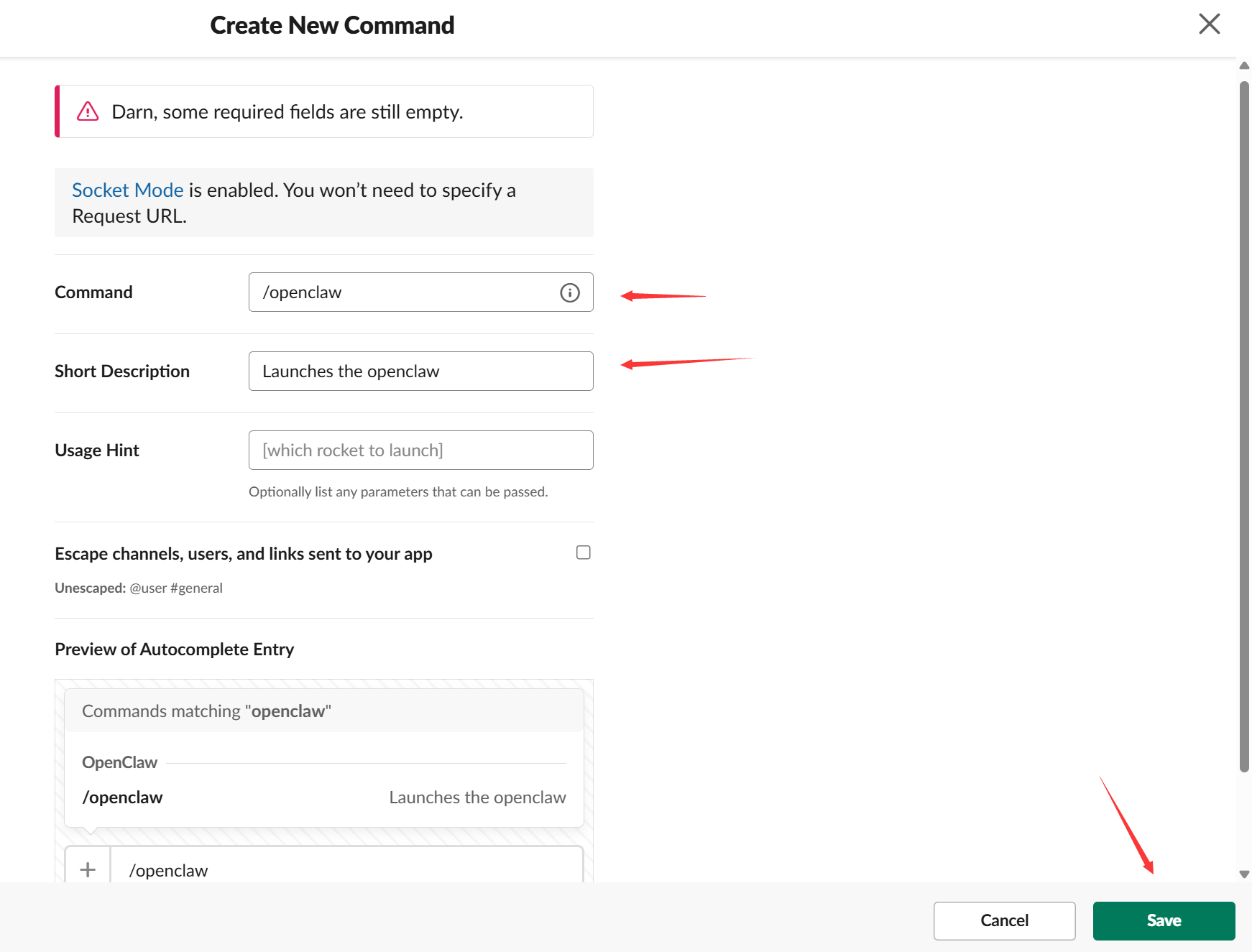 - Socket Mode:左侧菜单 → Socket Mode → 开启