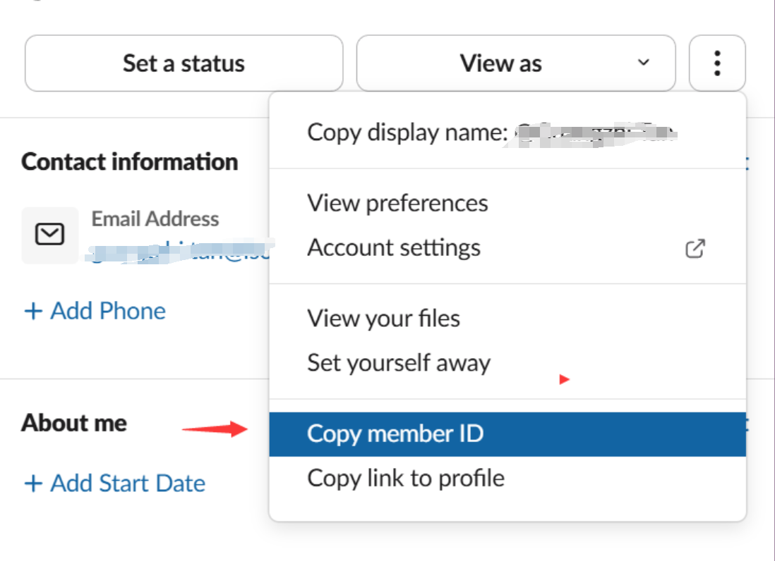 如何获取 Slack 用户 ID:打开 Slack → 点击左上角你的头像 → Profile → 点击右侧 ⋮ 更多按钮 → Copy member ID,得到的 格式字符串就是你的 ID。