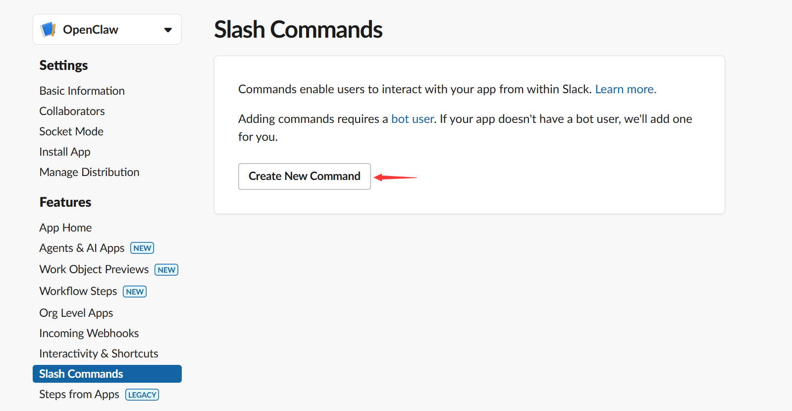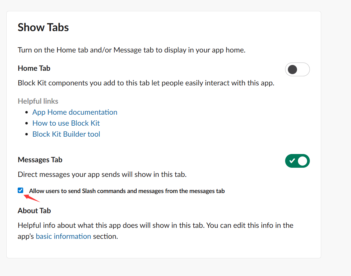 - App Home:左侧菜单 → App Home → 开启 Messages Tab -> 勾选下面的 “Allow users to send Slash commands and messages from the messages tab”