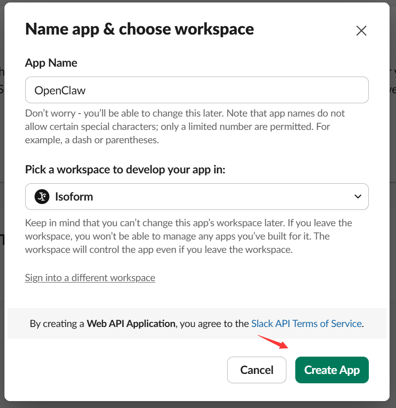 - 输入 App 名称(如 ),选择你的工作区