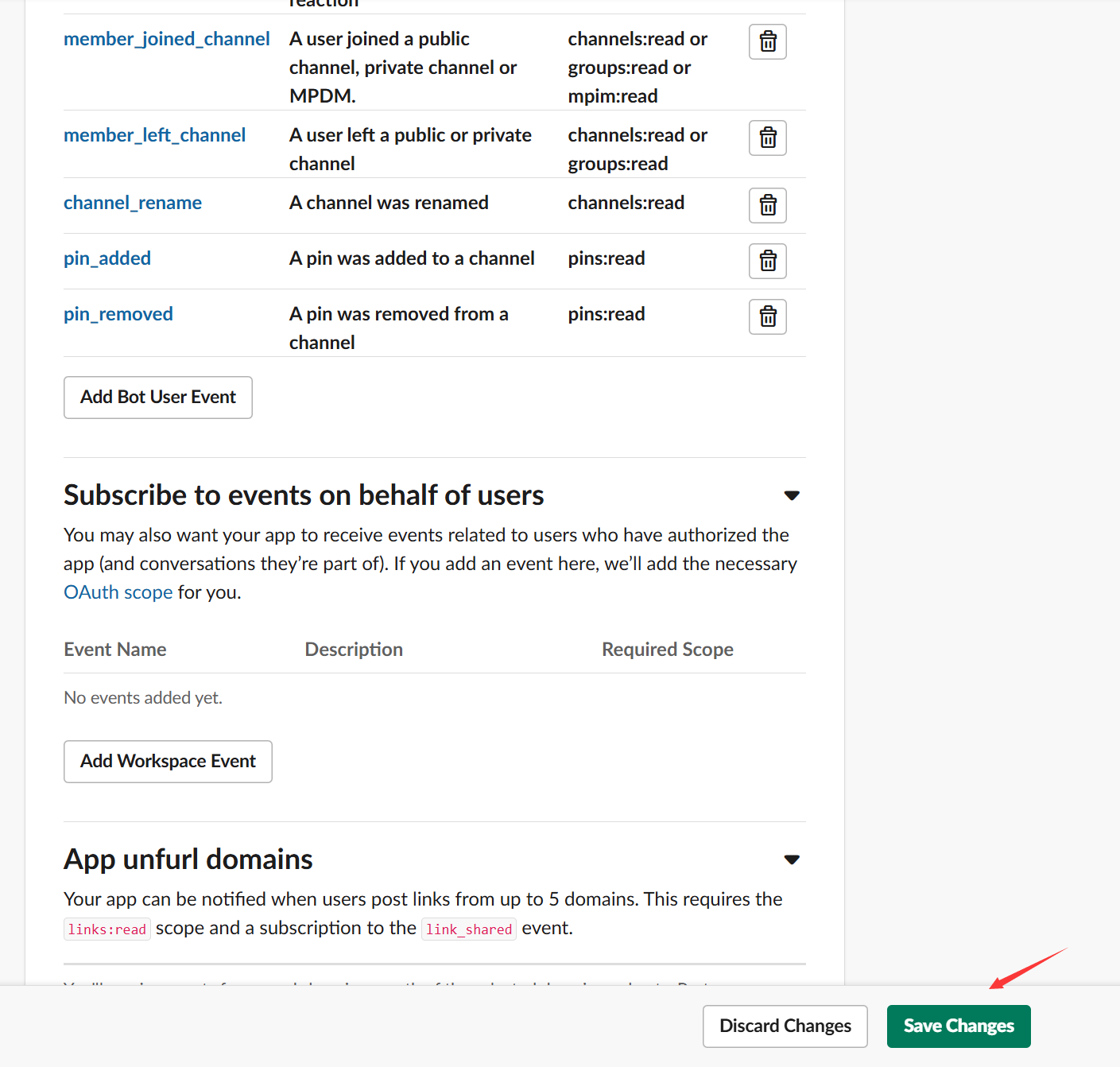 - Event Subscriptions:左侧菜单 → Event Subscriptions → 开启,添加以下 Bot Events: 、、、、、、、、、、、