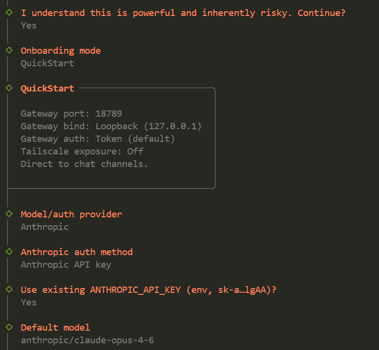 选择 QuickStart(推荐),会自动配置网关端口(18789)、绑定地址(127.0.0.1)等默认设置。