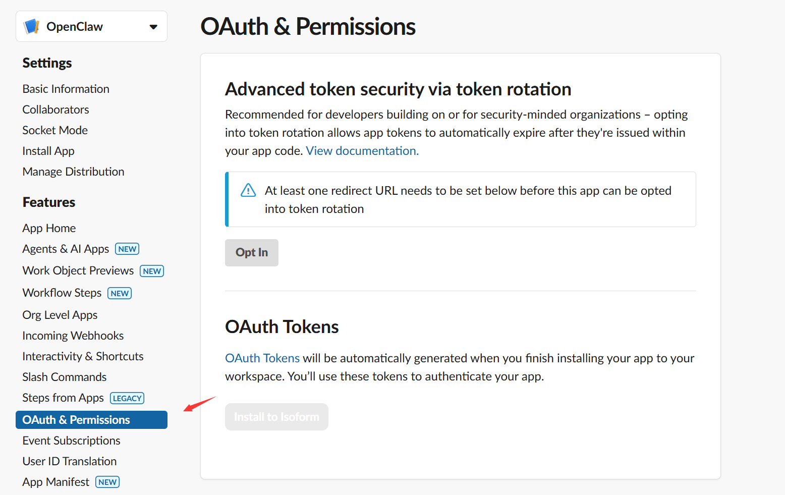- 在左侧菜单点击 OAuth & Permissions