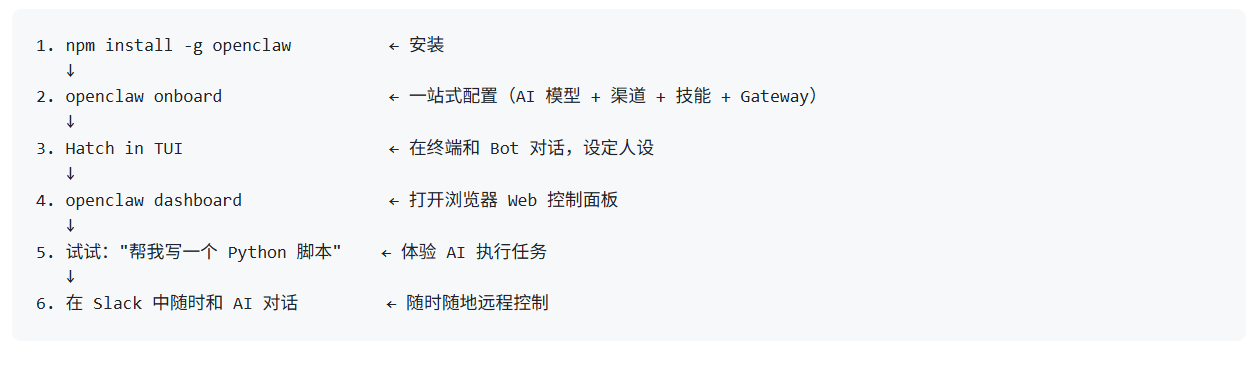 整个过程分 3 步:安装 OpenClaw → 运行 onboard 向导(配置 AI 模型 + 聊天渠道 + 技能 + Gateway)→ 开始使用。