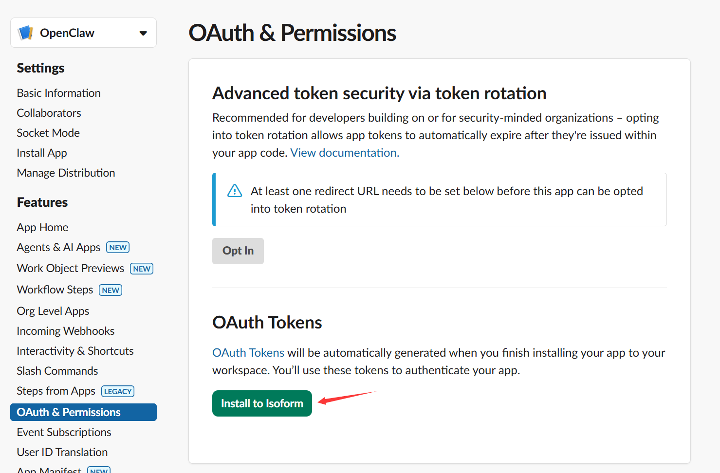- 安装完成后,复制页面上显示的 Bot User OAuth Token