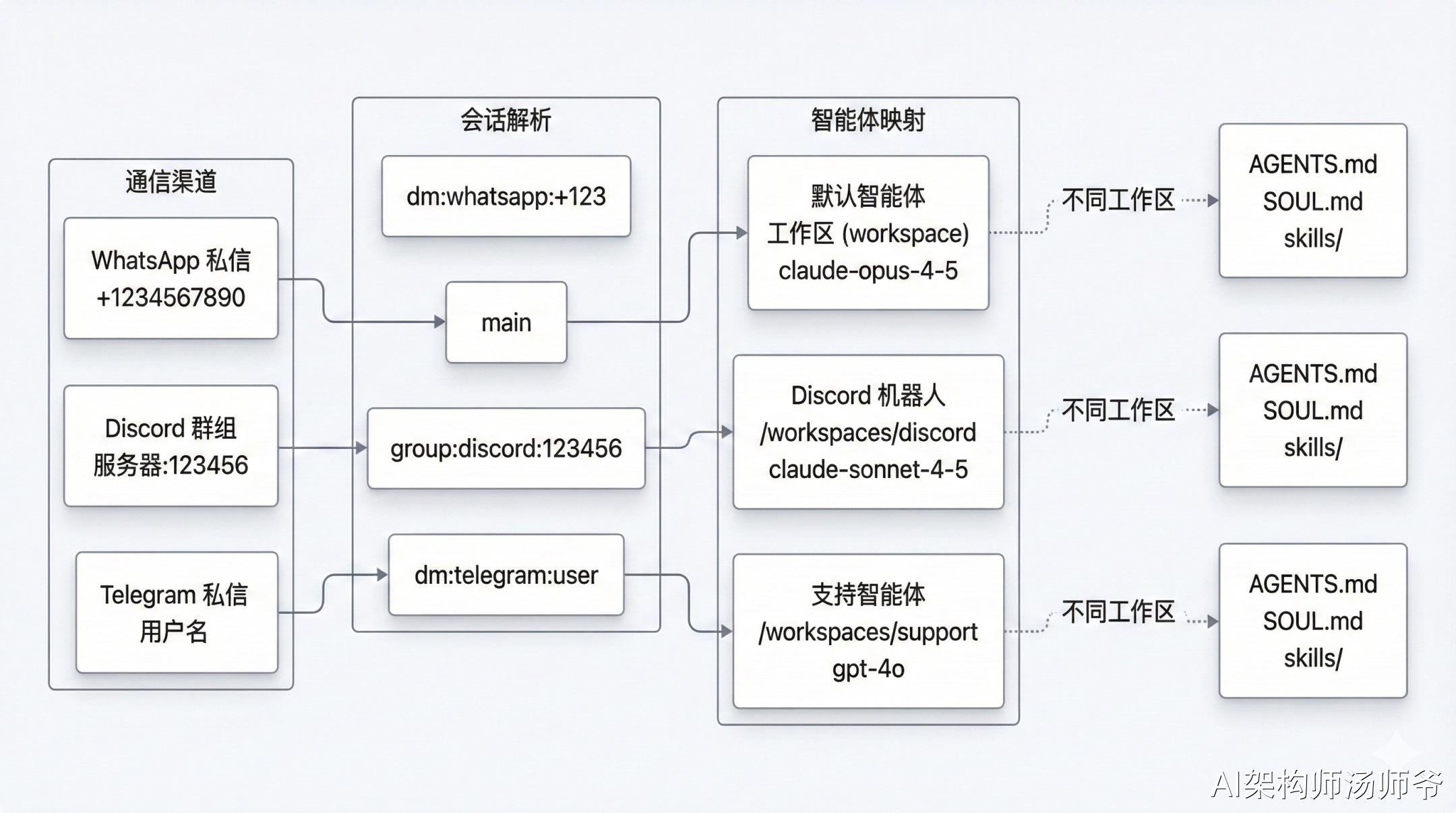 这样你就有了一个统一的 AI 助手,不管你从 WhatsApp、飞书 还是钉钉发消息,它都能接入。