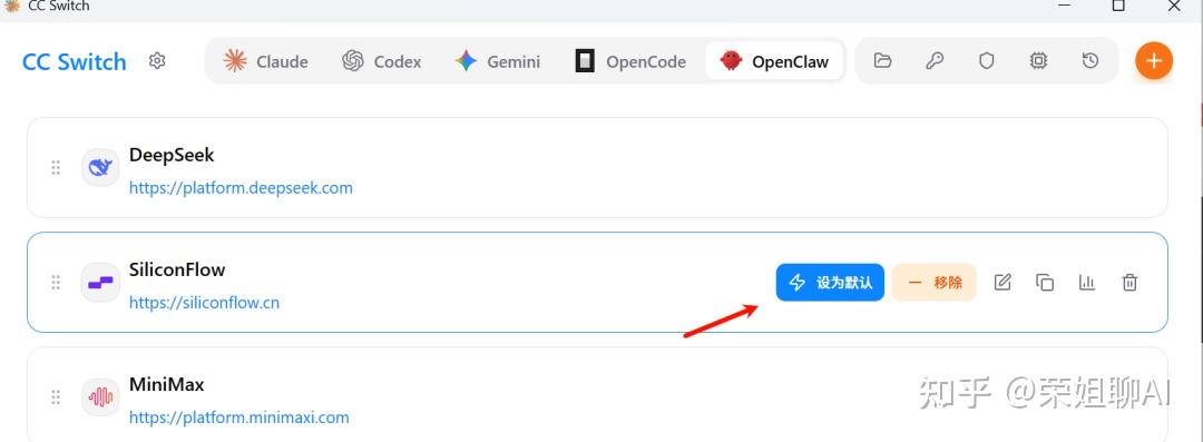 建议可以安装CC Switch,切换模型更方便。比如我选择SiliconFlow,选择设为默认,就可以切换模型了。