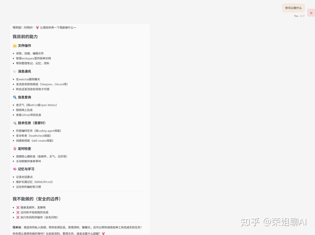文件操作、消息通讯、信息查询、技术任务、定时检查、记忆与学习,如果有什么不懂的就直接在这里问他就行。