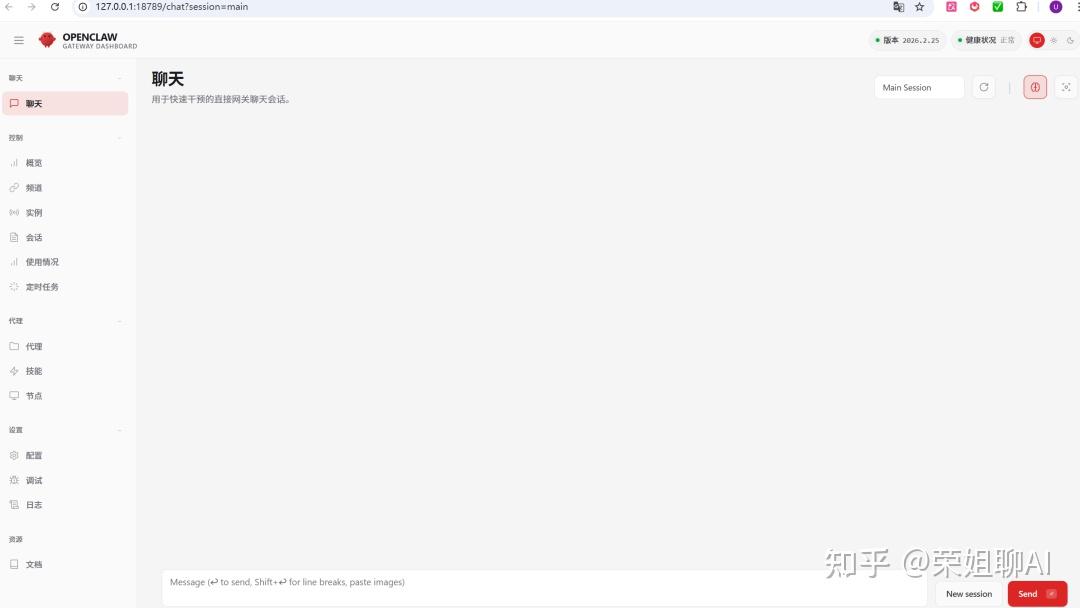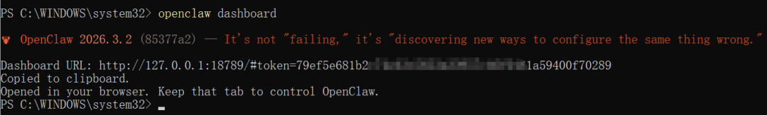 如果没有打开,使用命令openclaw dashboard打开,其实可以看到自动生成了一个带token的URL地址。