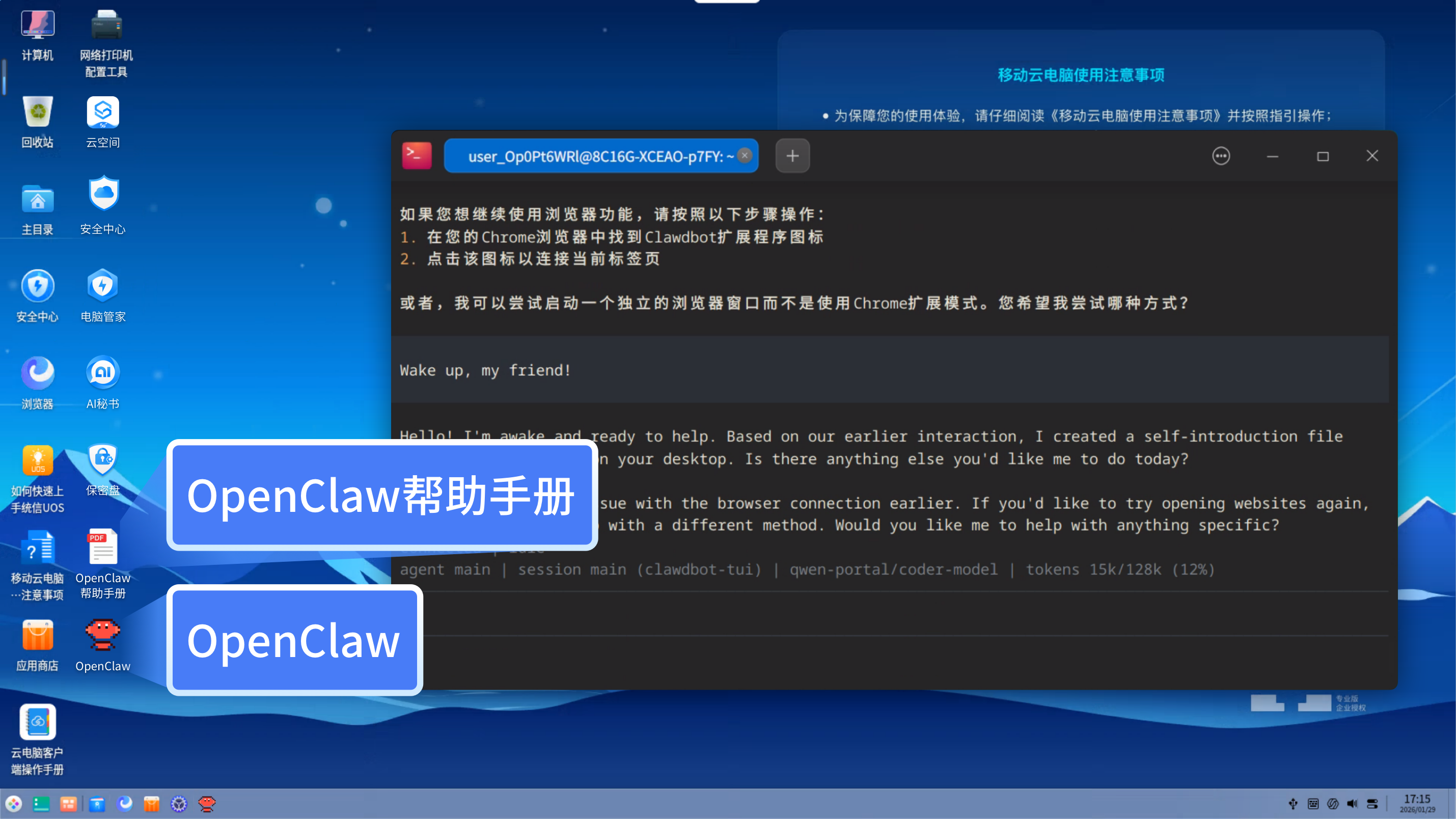 已订购分配或切换 OpenClaw应用镜像的目标云电脑用户,通过云电脑客户端连接进入桌面,点击【OpenClaw图标】进行初始化配置,可根据桌面中《OpenClaw帮助手册》内容,按照步骤配置完成后即可通过网页版与OpenClaw进行实时对话交互。