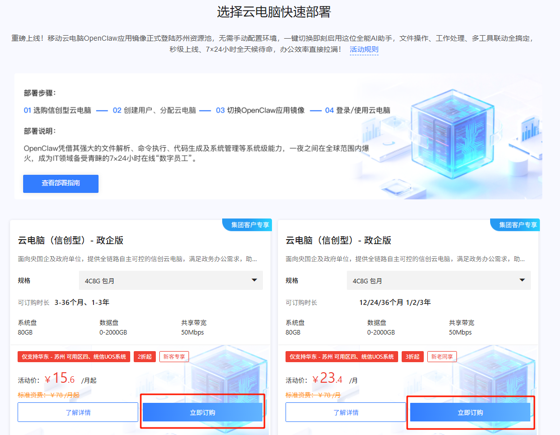 OpenClaw云电脑目前支持互联网用户及政企用户订购。