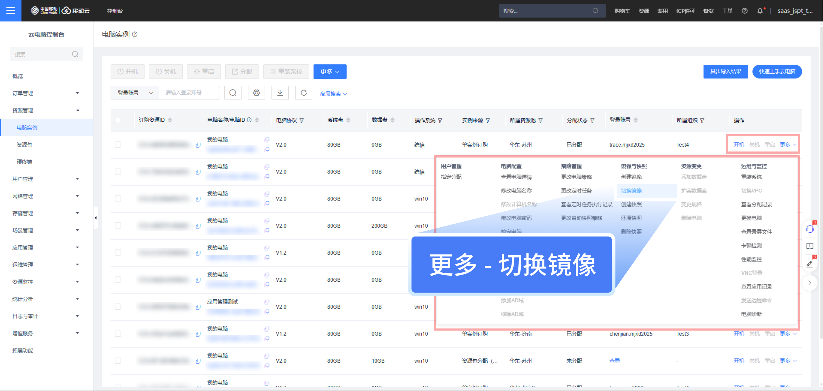 1、管理员前往云电脑控制台,在【资源管理】>【电脑实例】中点击操作列中【切换镜像】按钮或者列表上方【更多】>【切换镜像】按钮,弹出切换镜像功能弹窗。