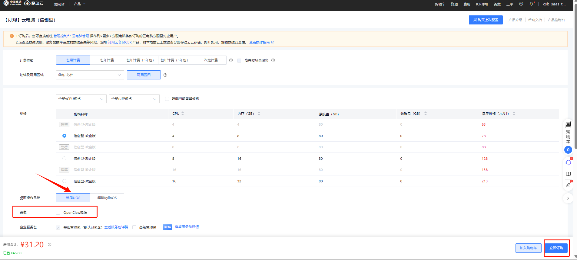 2、选择选择云电脑产品-云电脑(信创型),进行订购实例配置。订购时资源池选择“华东-苏州,可用区四”或“华北-北京3,信创专区”,桌面操作系统选择“统信UOS”,勾选OpenClaw镜像,配置您需要的云电脑规格,点击立即订购按钮,即可完成OpenClaw专属云电脑的订购操作。