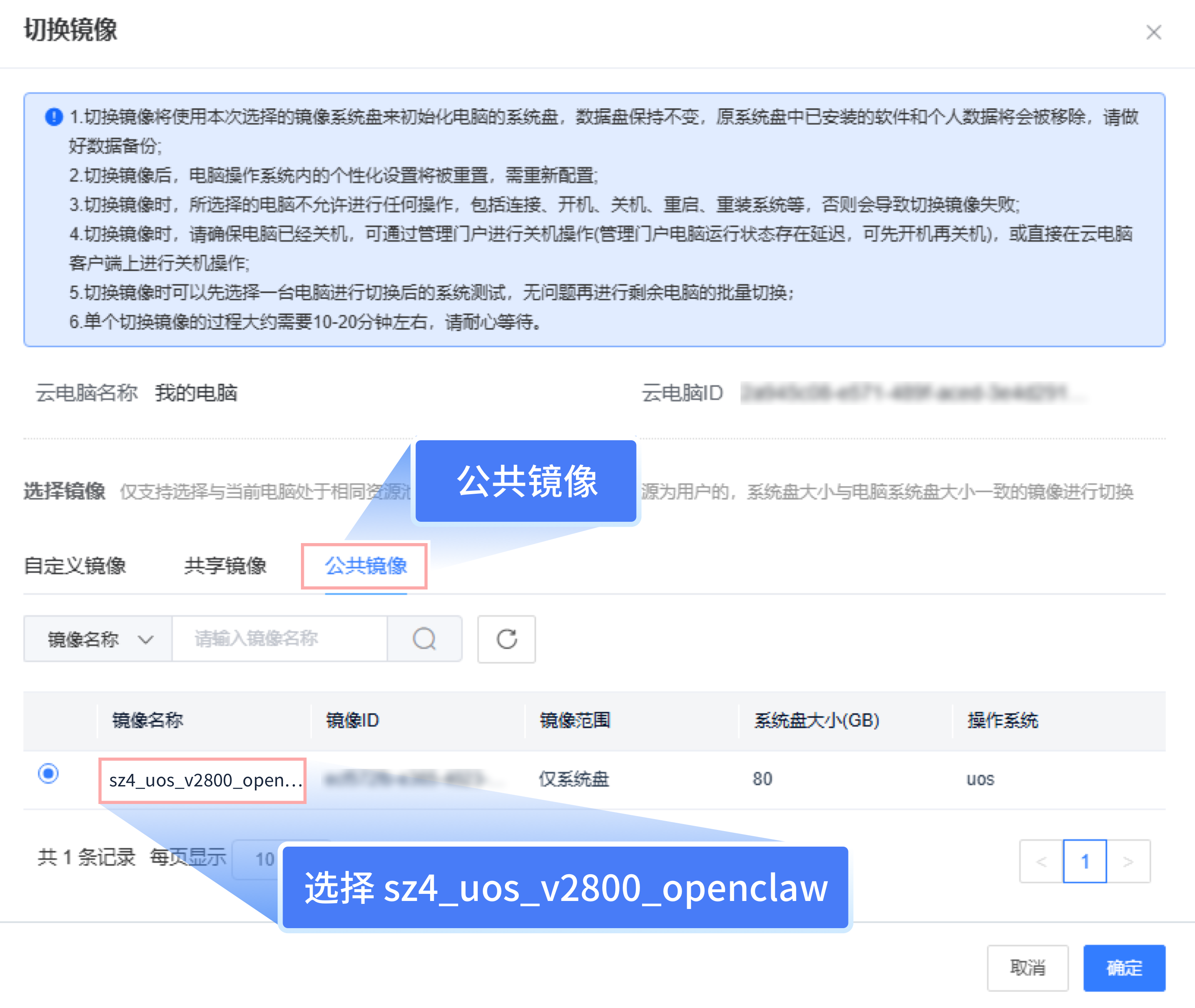 2、选择【公共镜像】中的镜像名称为“sz4_uos_v2800_OpenClaw(Moltbot)”字样的镜像,完成镜像切换。详细请参见电脑实例管理中管理员对实例进行指定分配、创建镜像、切换镜像的操作。