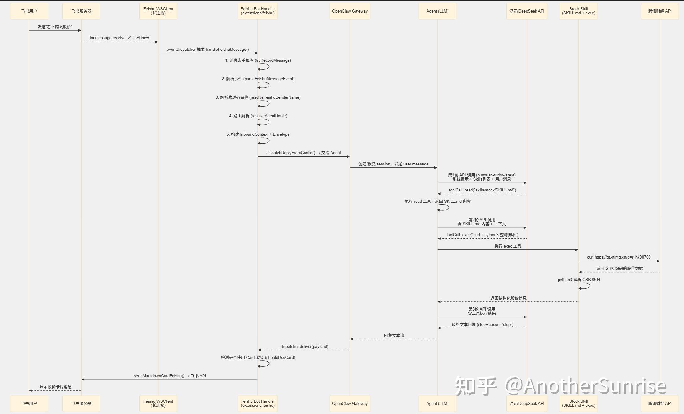 以下是基于云上机器部署openclaw的实际日志和源码分析,还原的从飞书到 OpenClaw 最终返回飞书的完整处理链路: