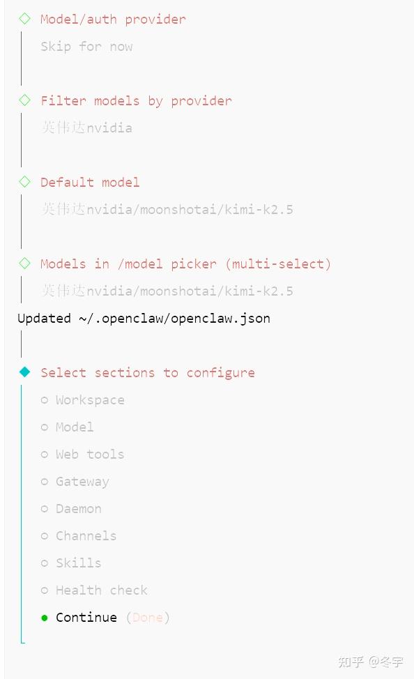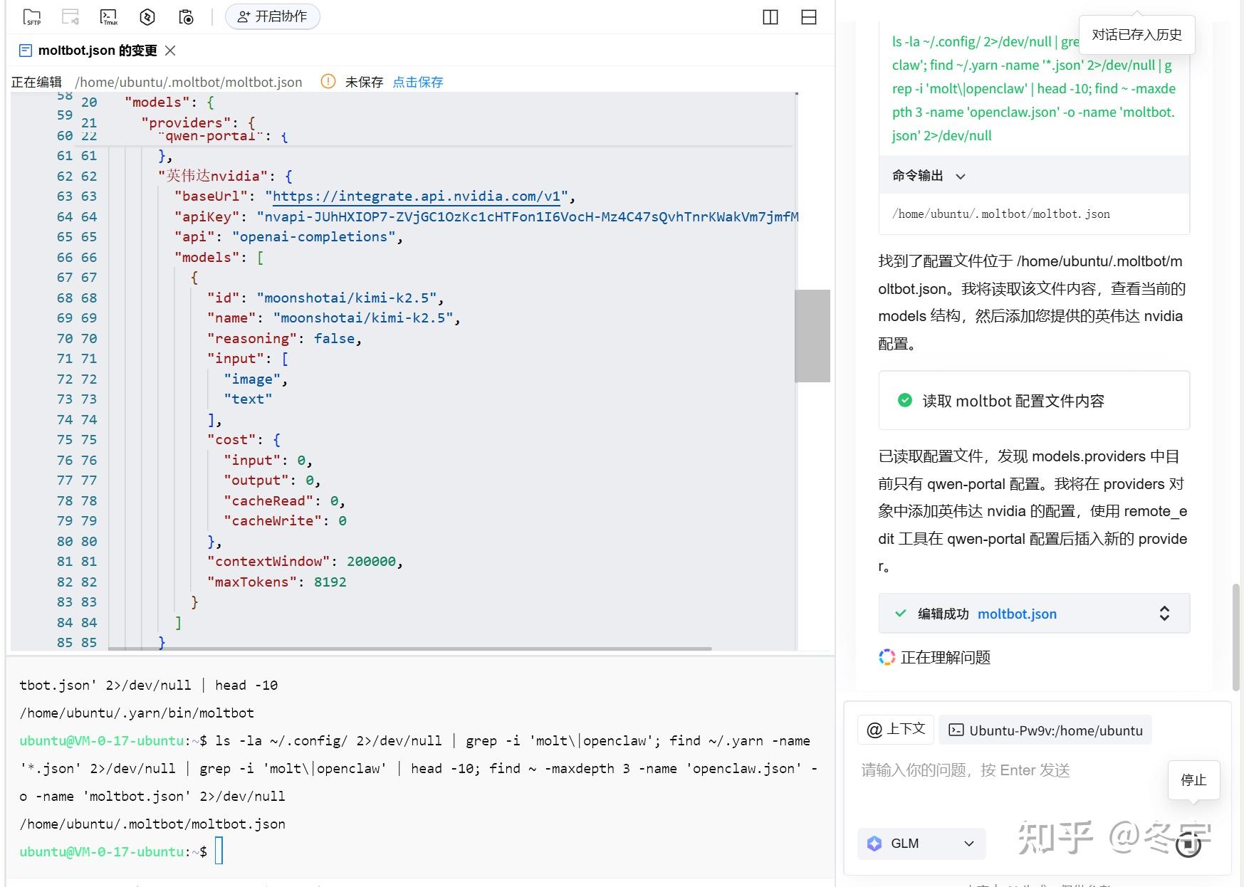 nvapi-HxKN8Zp2-xxxxx-替换成你的 key替换为你自己刚刚获取的 NVIDIA API Key。帮我打开 ~/.openclaw/openclaw.json文件,在 models 部分增加下面的代码,注意:providers 外面还要加一层 models,如果原来配置有models就加到原来的里面 { “models”: { “providers”:{ “英伟达nvidia”: { “baseUrl”: “https://integrate.api.nvidia.com/v1”, “apiKey”: “nvapi-HxKN8Zp2-xxxxx-替换成你的 key”, “api”: “openai-completions”, “models”: [ { “id”: “moonshotai/kimi-k2.5”, “name”: “moonshotai/kimi-k2.5”, “reasoning”: false, “input”: [ “image”, “text” ], “cost”: { “input”: 0, “output”: 0, “cacheRead”: 0, “cacheWrite”: 0 }, “contextWindow”: , “maxTokens”: 8192 } ] } } } }
