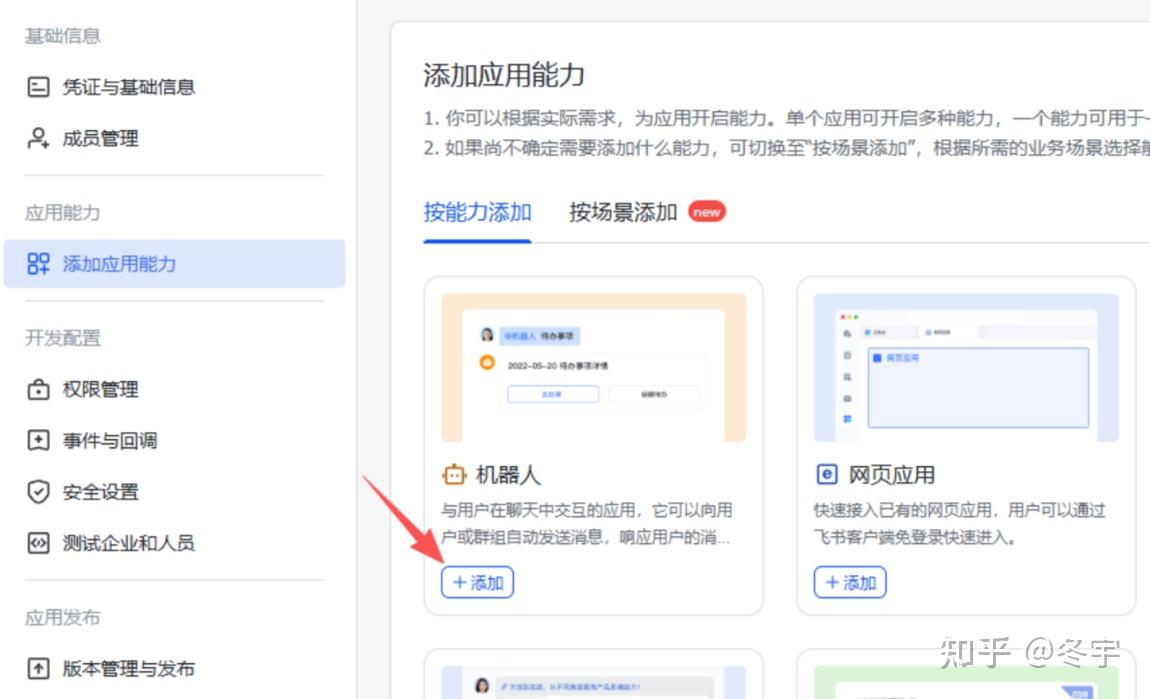 - 添加机器人能力: 在左侧菜单选择“应用能力”,找到“机器人”并点击“添加”。