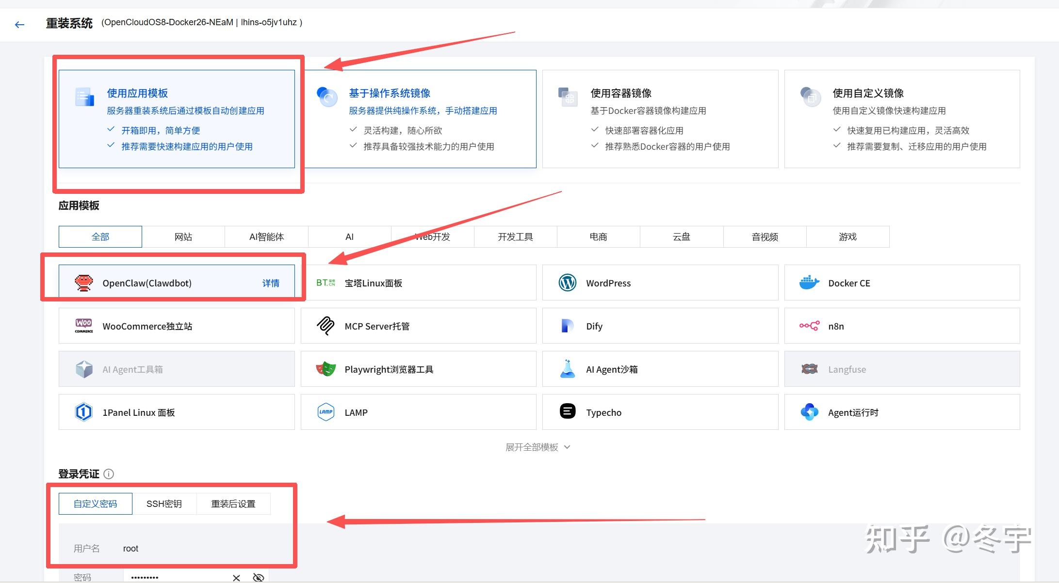 - 选择 Openclaw 模板: 在弹出的窗口中,选择“应用模板”,然后在众多模板中找到并选中“Openclaw”。勾选同意条款,并确认“无需备份,直接重装”。