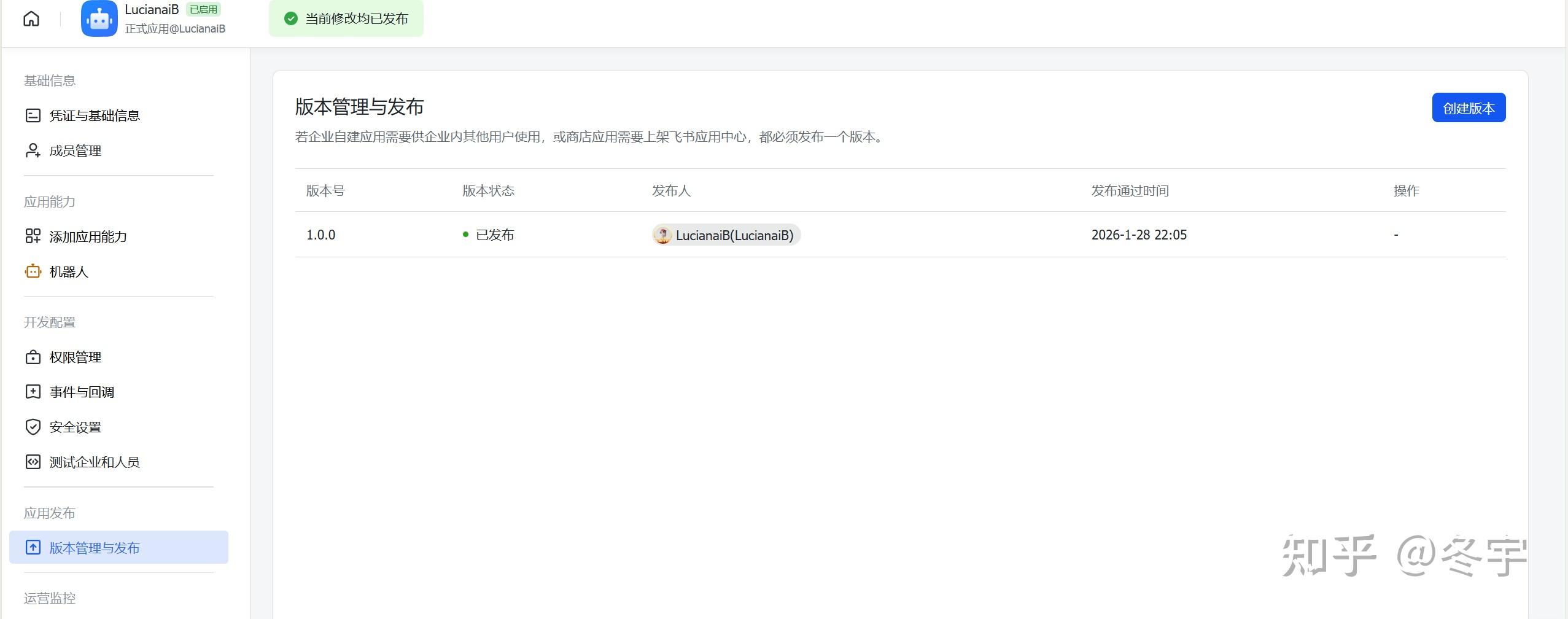 - 发布应用: 最后一步!在左侧菜单选择“版本管理与发布”,点击“创建版本”,然后按照提示填写版本信息(可以简单填写),最后点击“申请线上发布”。应用发布后,你的机器人才能在飞书中被搜索到并使用。