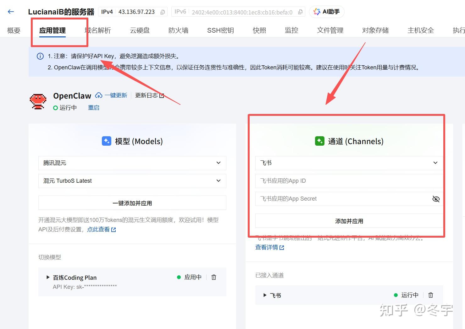 - 连接 Openclaw 与飞书: 回到 腾讯云控制台,进入你的服务器详情页,点击左上角的“应用管理”。在“通道”设置中,选择“飞书”,然后将刚才复制的