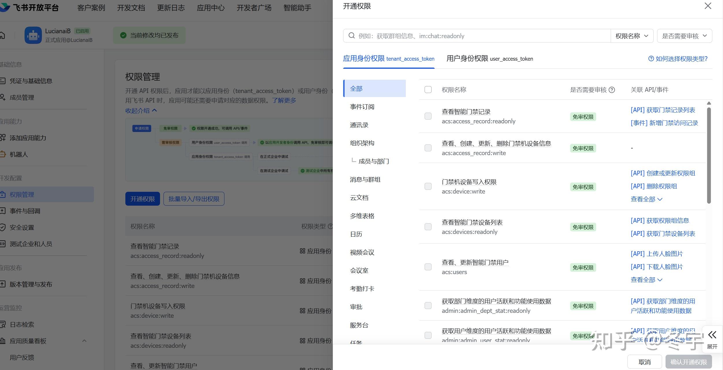 - 开通机器人权限: 这是非常关键的一步。在左侧菜单选择“权限管理”,为了确保机器人能正常工作,我们需要为它开通必要的权限。原教程建议“开通全部权限”,对于初学者来说,最简单的方式是批量开通。找到并勾选所有与消息、群组、用户读取相关的权限。特别是以下几类: