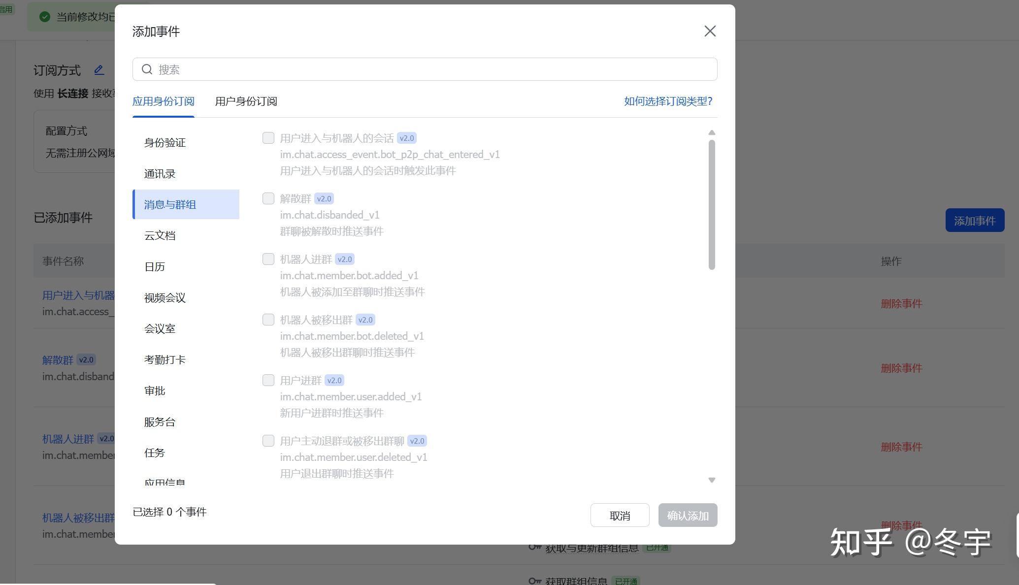 - 在“添加事件”部分,找到“消息与群组”分类,将里面的所有事件(如“接收消息”、“用户进群”等)全部勾选上。
