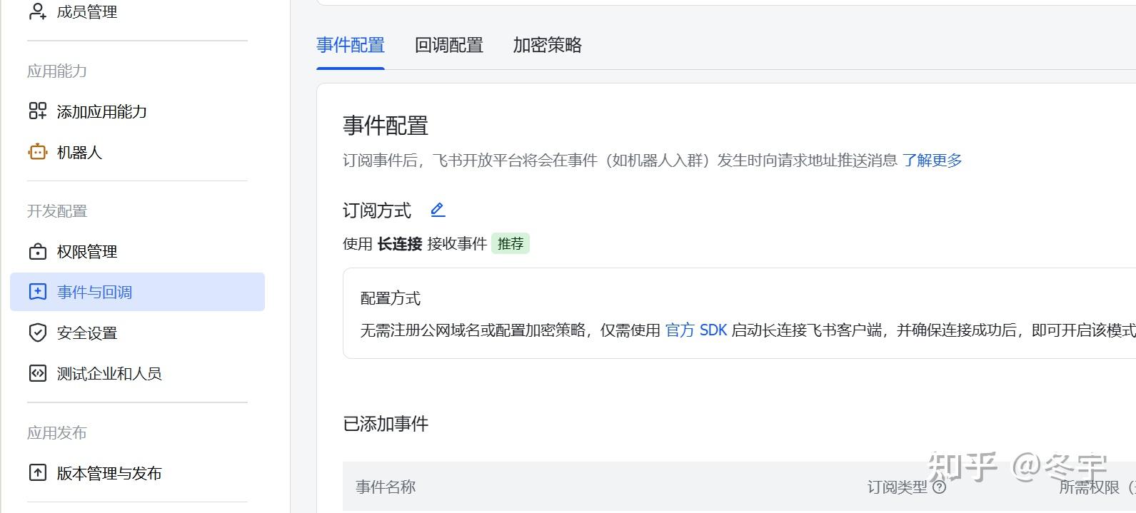 - 配置事件订阅: 再次回到飞书开放平台。在左侧菜单选择“事件与回调”。