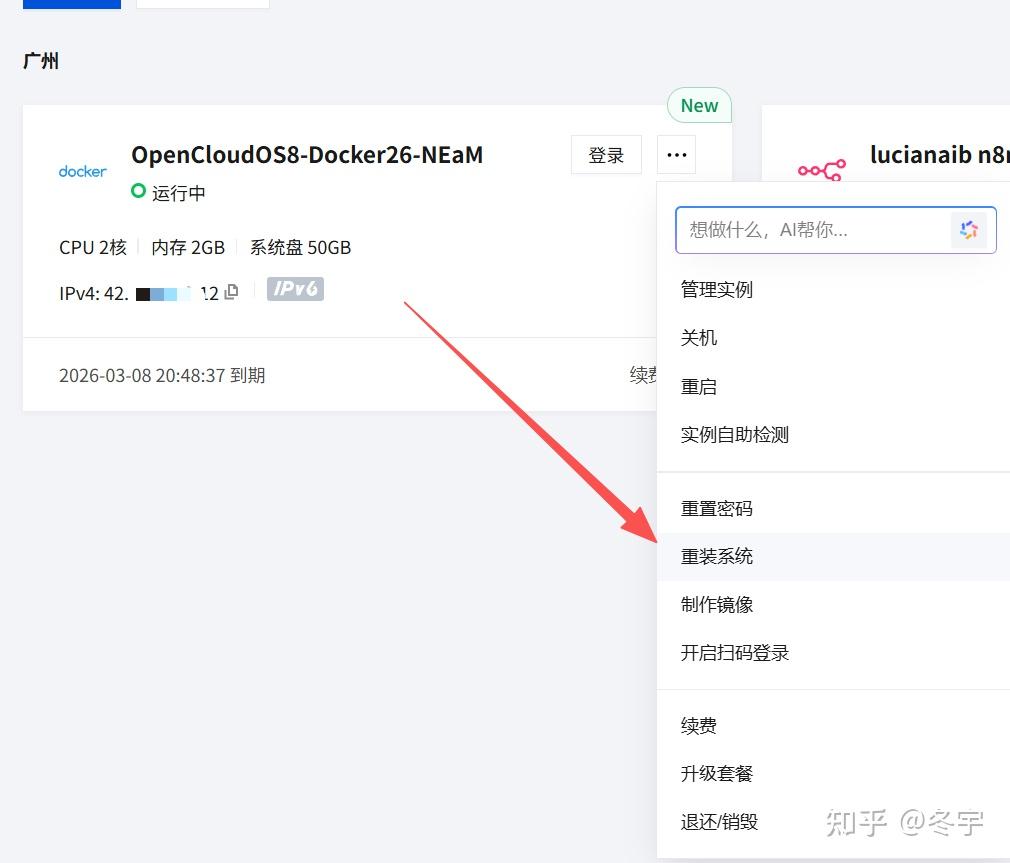 - 重装系统: 在你的服务器实例卡片上,点击“更多” -> “重装系统”。