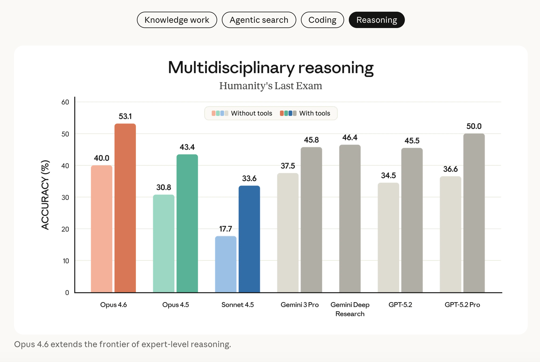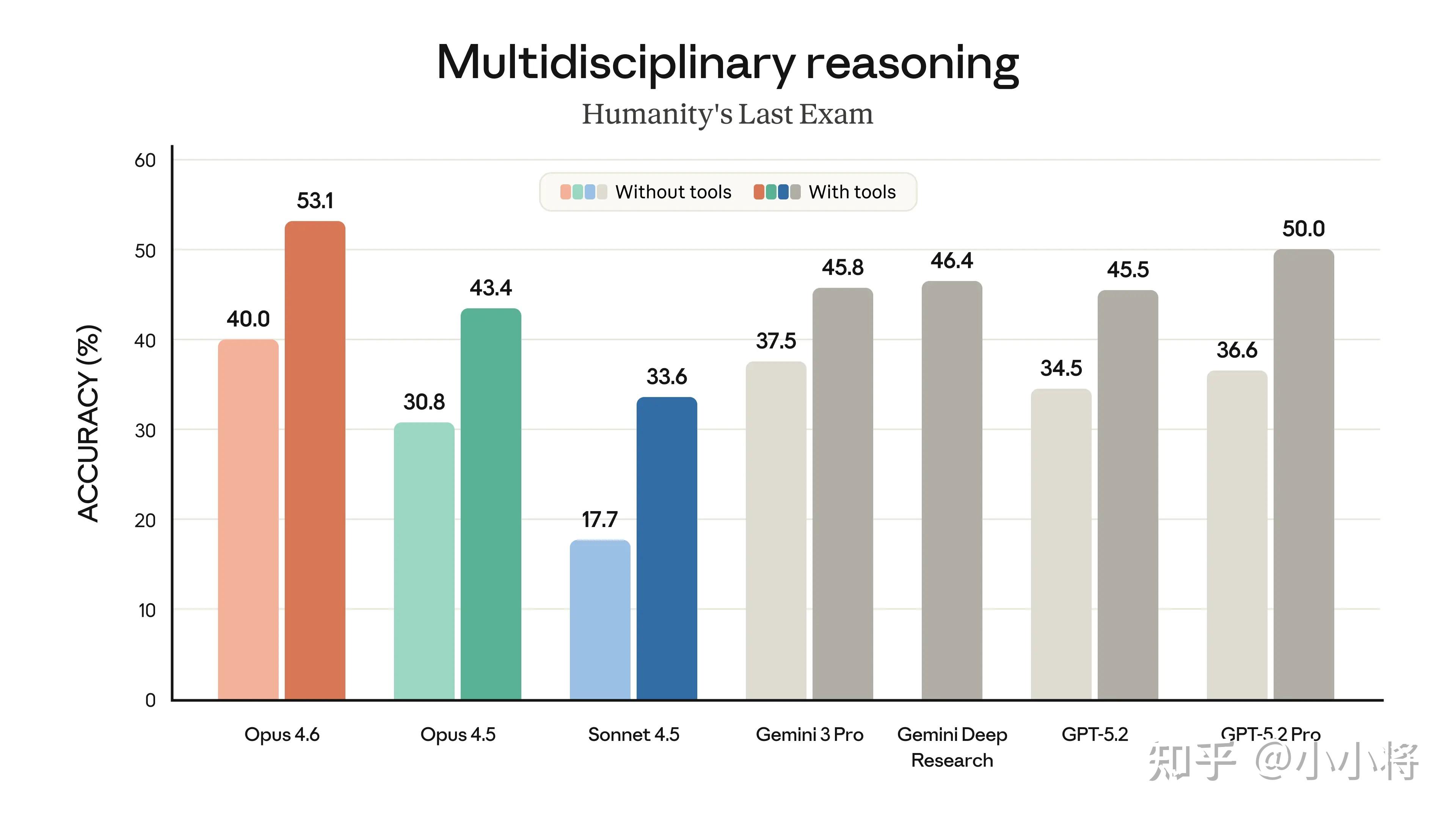 在复杂的多学科推理测试 Humanity’s Last Exam 上,也领先所有其他前沿模型(超过 GPT-5.2 Pro)。