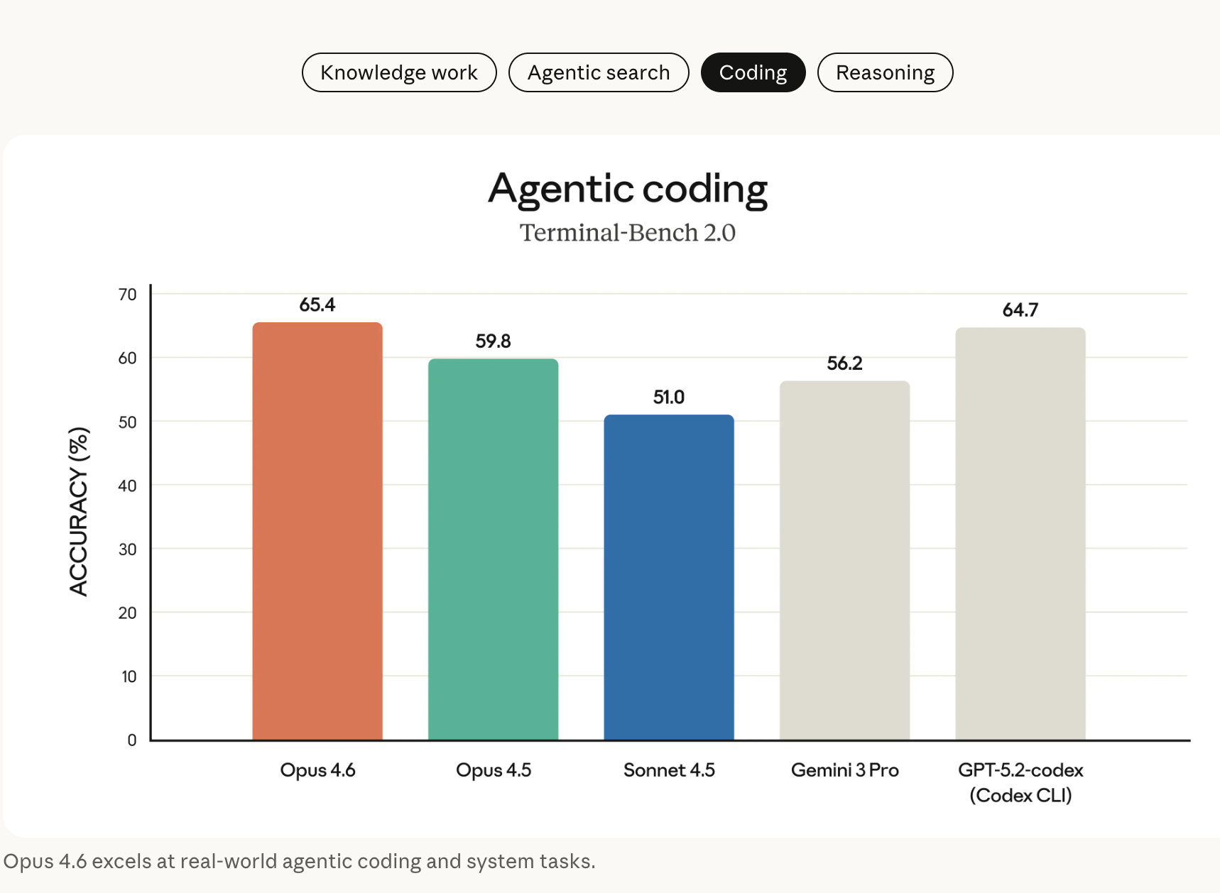 - 能力提升显著:在编程、Agent 操作和计算机使用场景中,相比 Opus 4.5 有明显提升。在代理式编程评测集 Terminal-Bench 2.0 上,Opus 4.6 的表现超过 GPT-5.2,达到了 SOTA 水平。